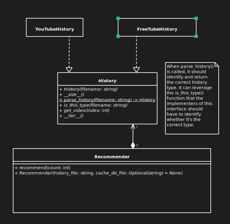 filenameis of typestr, the function argument should befilename: str)parse_history()is not static (that is, you already need to have an instance ofHistoryto call it).passinstead.parse_history()needs implementation.Also, it seems like at least one implementation of the interface should be created for
